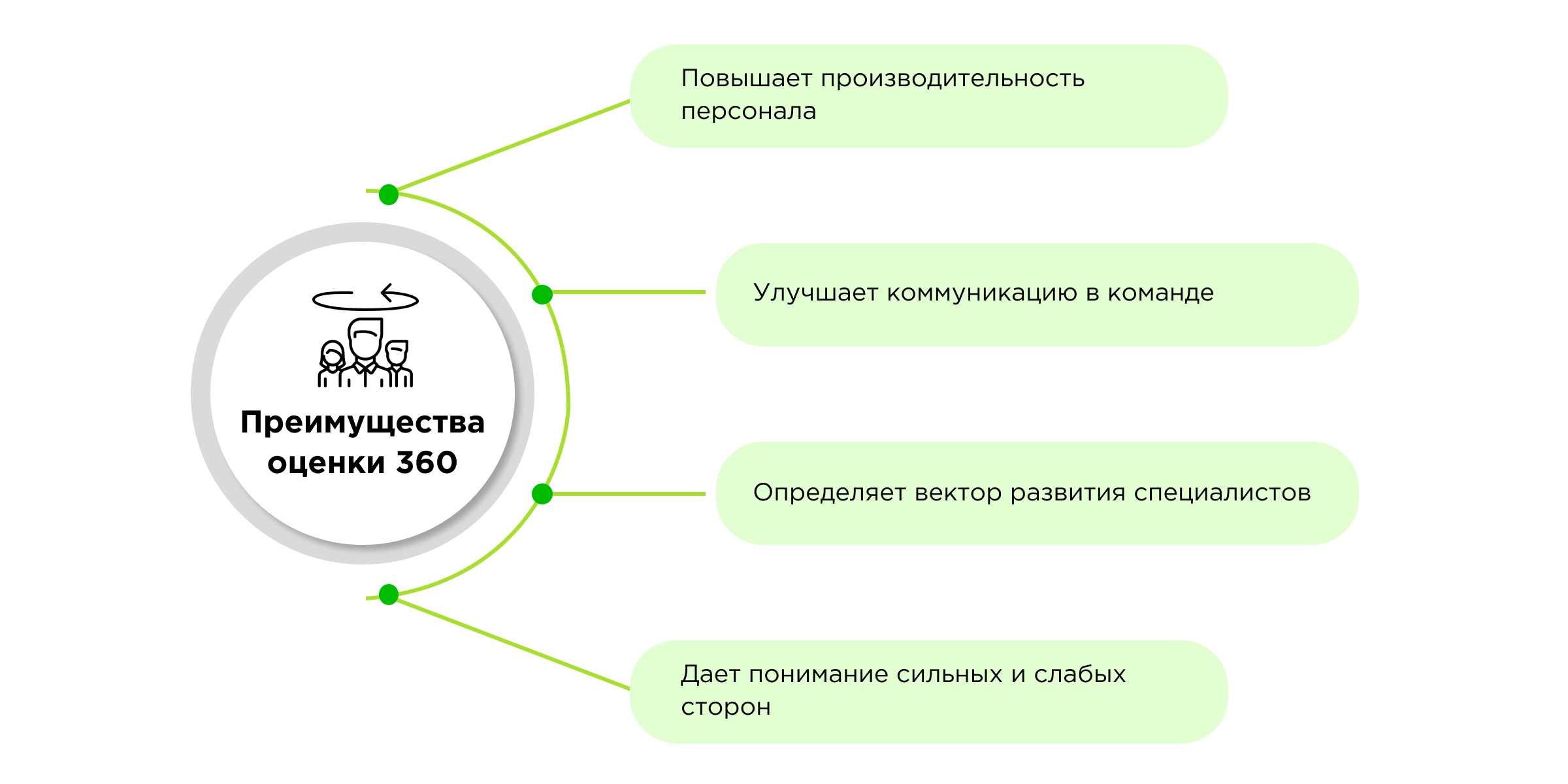 - Полнота данных. Сотрудники получают максимально подробную обратную связь от ближайшего рабочего окружения — коллег, руководителей, подчиненных и клиентов.
