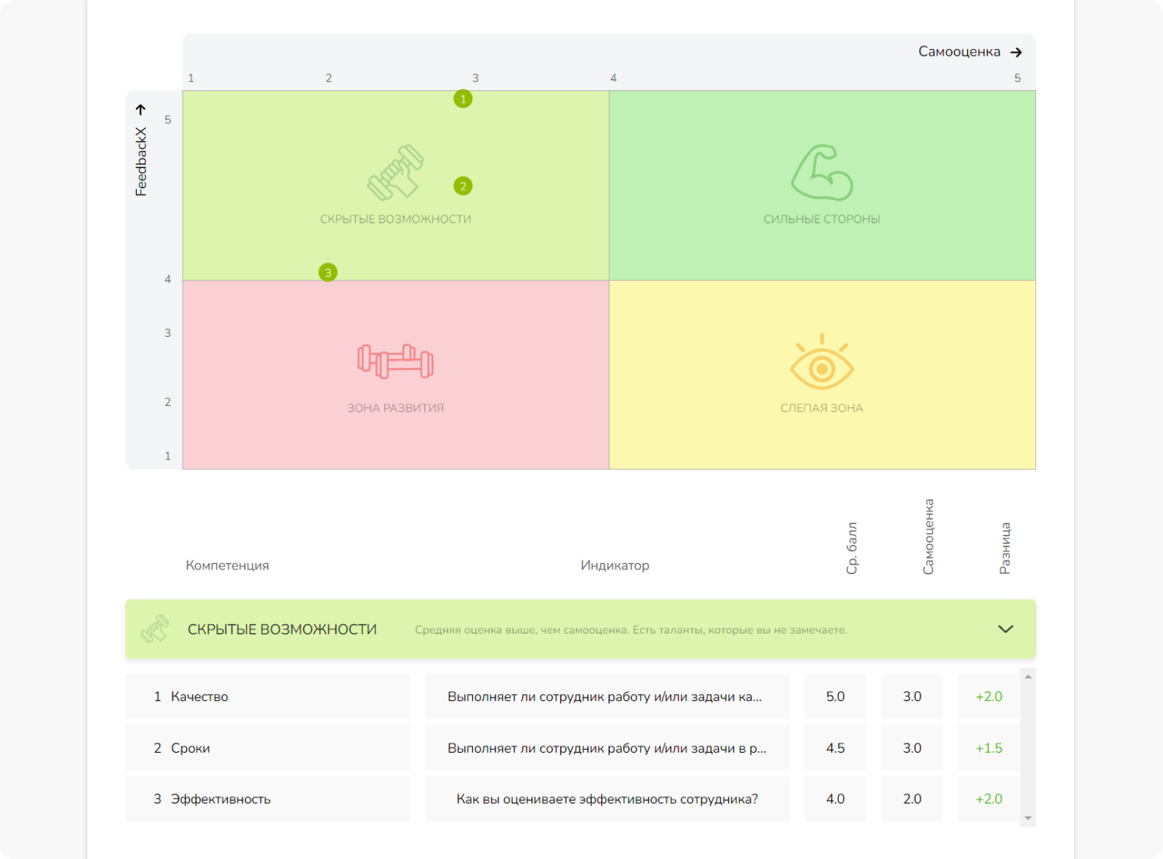 Во вторую очередь платформа демонстрирует компетенции с завышенной самооценкой и «зоны роста» с низкими оценками — то, что для развития требует усилий от сотрудника и инвестиций в обучающие мероприятия от компании.