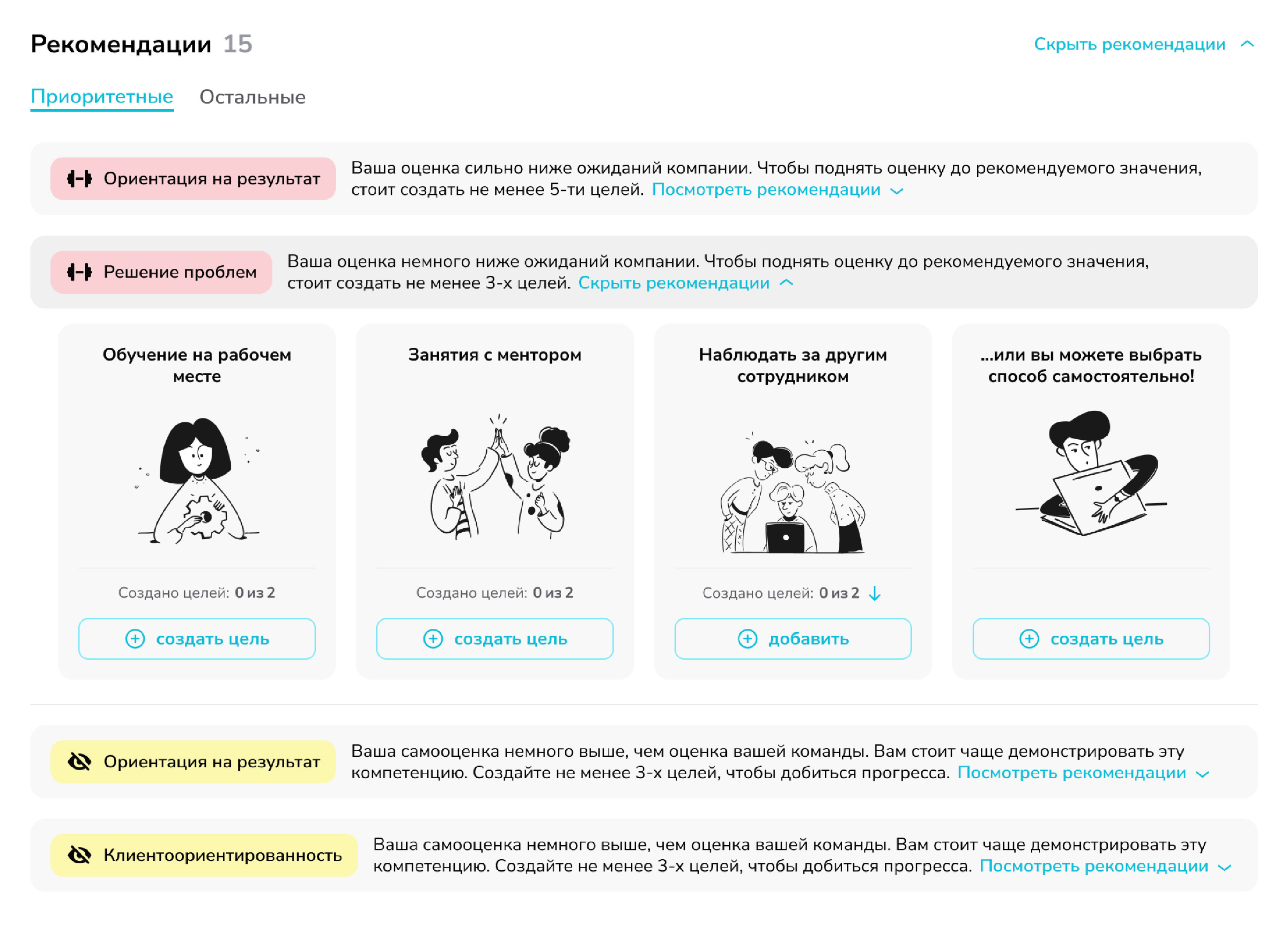 Платформа подсвечивает сотруднику приоритеты для развития, после чего он может выбрать из набора универсальных или добавленных клиентом мероприятий и согласовать план развития с руководителем в личном кабинете.