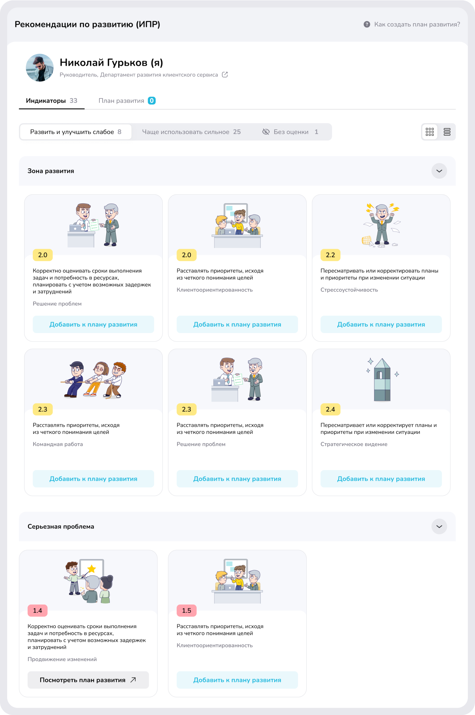 Оптимальное решение – зафиксировать ИПР непосредственно на платформе, на которой проводилась оценка. Так, при обсуждении результатов и руководитель, и сотрудник будут видеть критерии, результаты и библиотеку развивающих действий на выбор. Кроме того, на платформе будет видна динамика, и план можно будет не создавать с нуля, а корректировать в процессе.