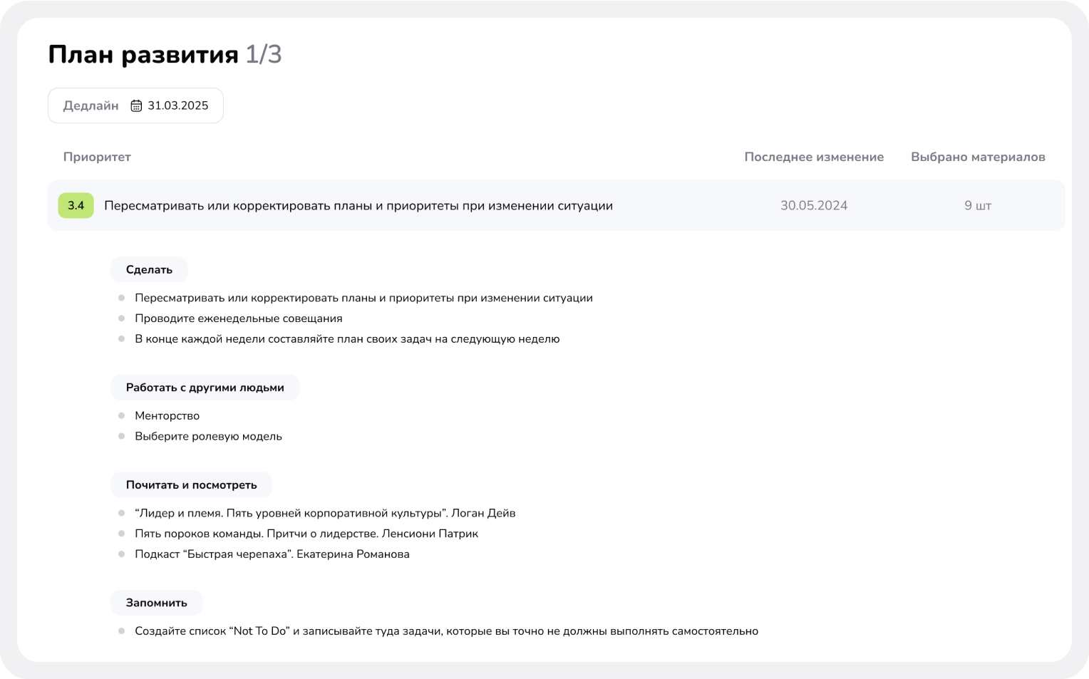 Платформа подсвечивает сотруднику приоритеты для развития, после чего он может выбрать из набора универсальных мероприятий (курсы, статьи, тренинги и т. д.) или добавить свои, а также уведомить руководителя о готовности своего ИПР.